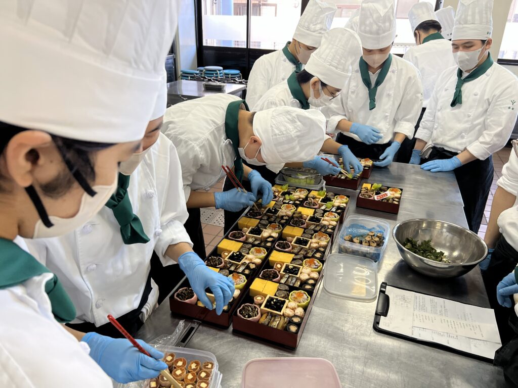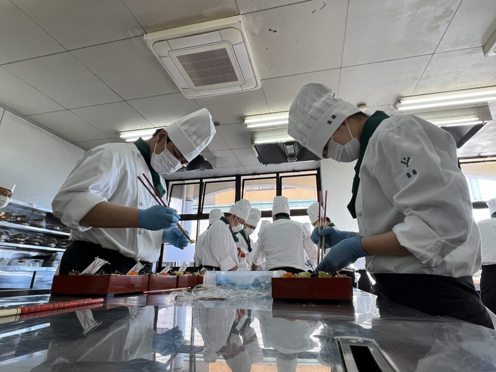 12月18日(木)3年生が調理科・製菓科の合同おせち実習を実施しました。調理科はおせち料理、製菓科はスイーツおせちを数回の実習に渡って仕込みを行い、今回の合同実習で完成させました。生徒達はこれまでの実習の集大成ともなる授業に、意欲的にそして一生懸命に実習に取り組んでいました。