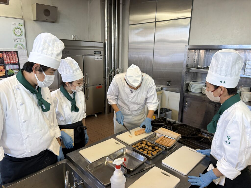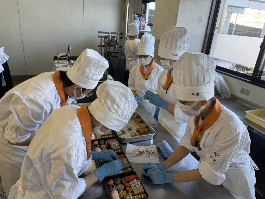 「12月18日に調理科、製菓科合同でおせち実習を行いました。私の班は抹茶のマカロン、ノワゼットショコラ、練り切りでは竹を担当しました。マカロンを絞る作業を複数人で行ったため、マカロンの厚みをそろえることが特に大変でした。素早くかつ丁寧な作業できれいなおせちを作り上げることができました。」