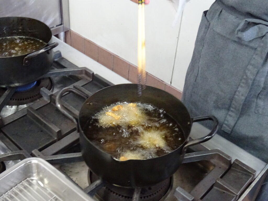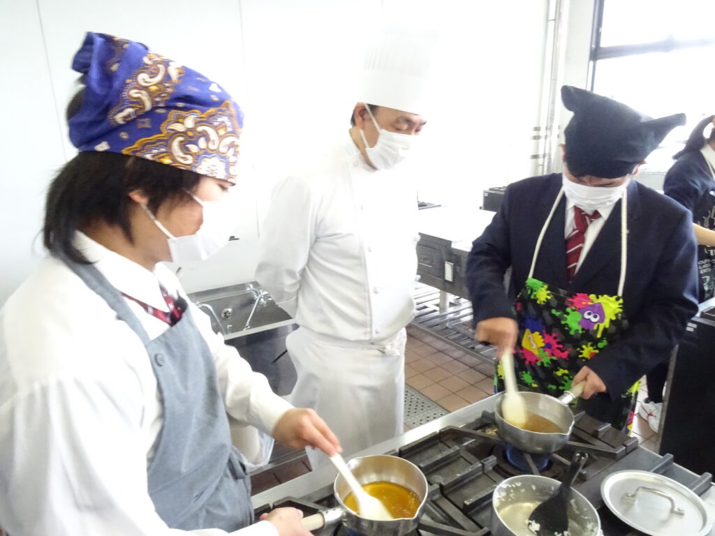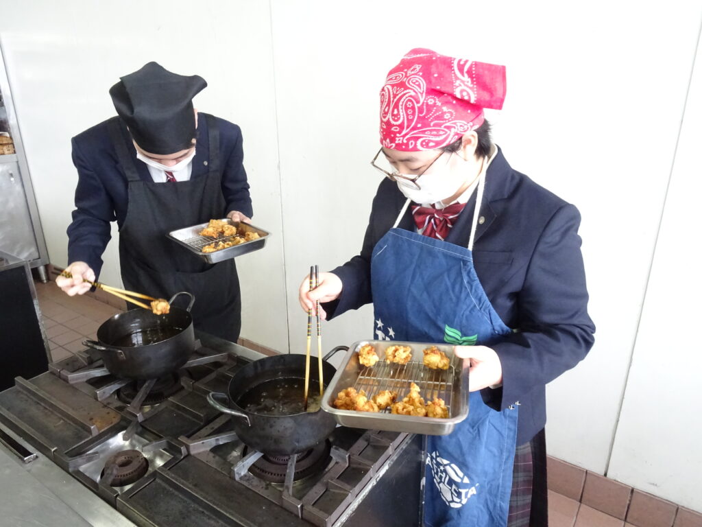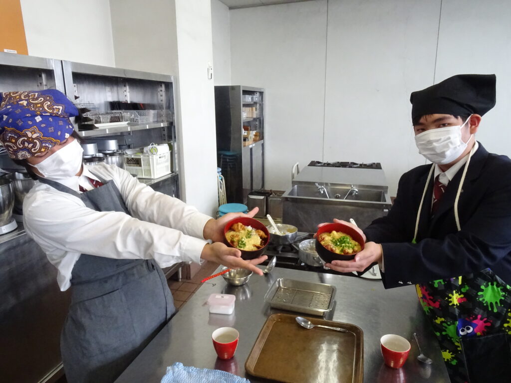 1月23日(金)普通科調理実習(親子丼)を実施しました。今回の親子丼は、鶏のから揚げをご飯の上に乗せて、その上に卵の餡をかけたもので、ちょっと変わった親子丼でした。今年度初めて揚げ物の実習でした。生徒たちは、見たことない形の親子丼にびっくりしながらも、鶏と卵で親子丼と納得し、美味しくいただきました。