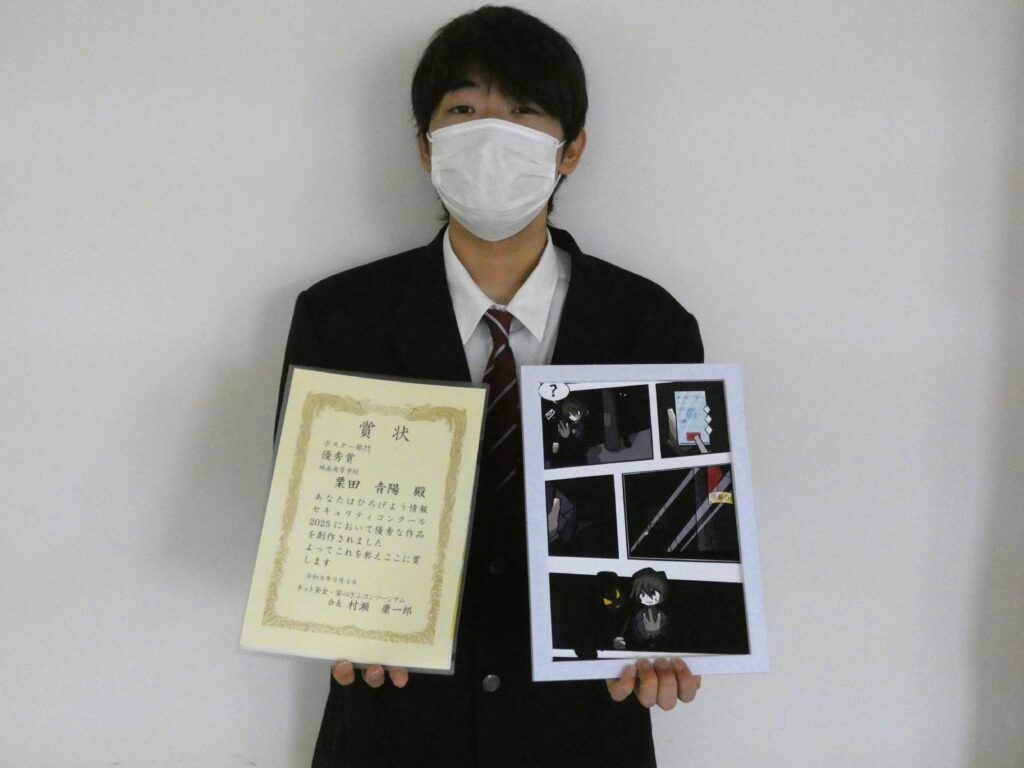 コンテストに入賞しました! 2026年3月18日 「ひろげよう情報セキュリティコンクール2025」のポスター部門で、普通科2年生の栗田さんが、優秀賞<ネット安全・安心ぎふコンソーシアム>を受賞しました。作品制作を通じて、情報セキュリティの大切さを学ぶことができました。おめでとうございます!